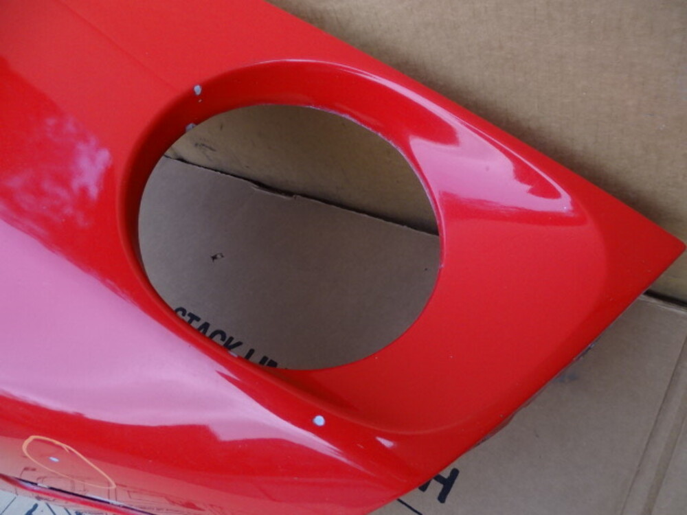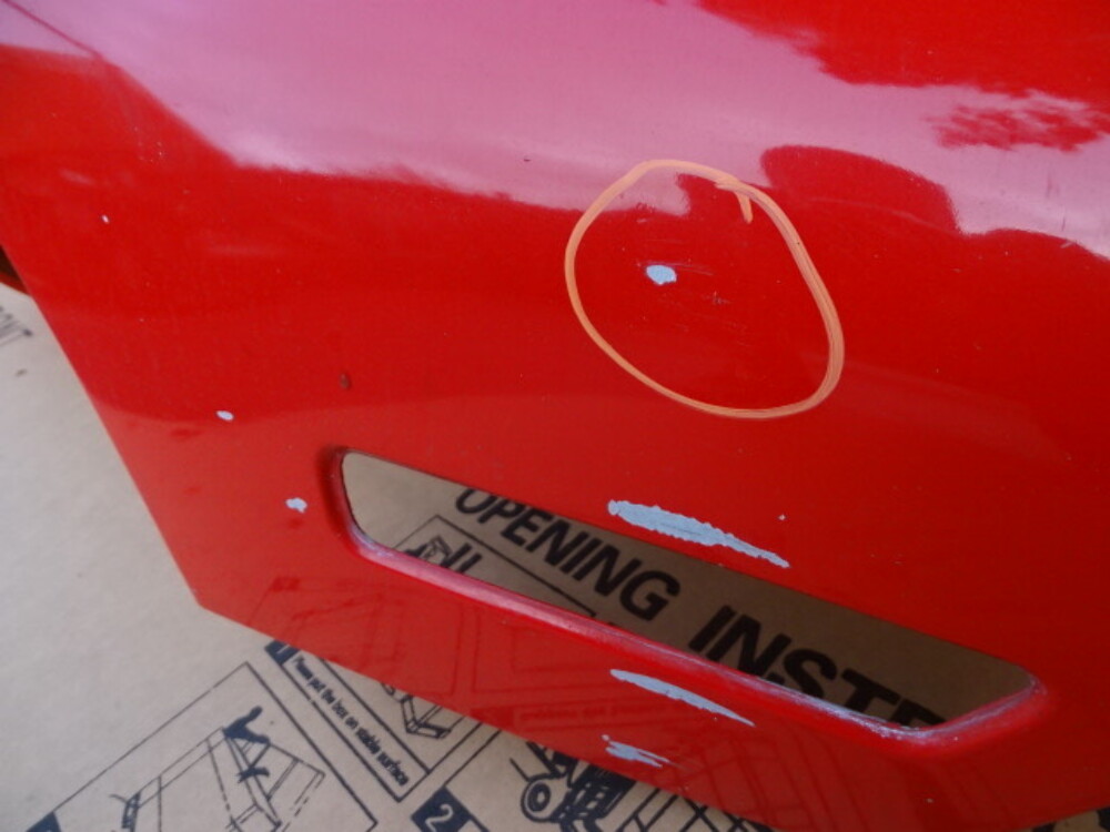 Paint color is red. Has scratches and markings. Has a dent circled.
